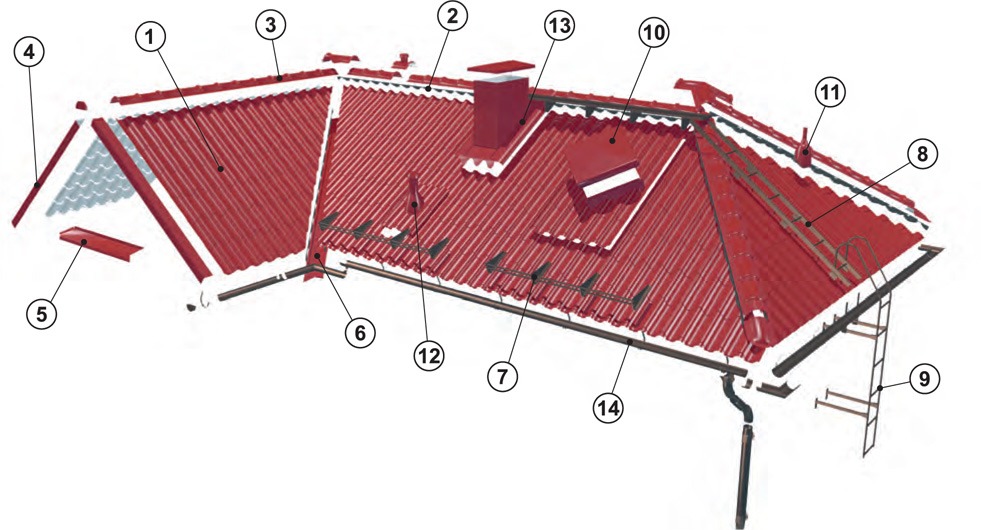 Профиль металлочерепицы спроектирован так, чтобы не только внешне напоминать черепичную кладку, но и эффективно отводить воду, успешно выдерживать давление снежного покрова, обеспечивать циркуляцию воздуха под скатом. Важны длина, ширина, высота и шаг волны, а также форма профиля. Основные характеристики: